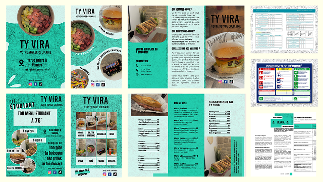 J’ai effectué mon stage chez Ty Vira, un snack inspiré des voyages de son propriétaire. J’y ai créé toute l’identité visuelle de la marque ainsi que les supports de communication associés : logo, cartes, flyers et affiches. Une expérience qui m’a permis d’affirmer ma patte graphique et ma créativité.