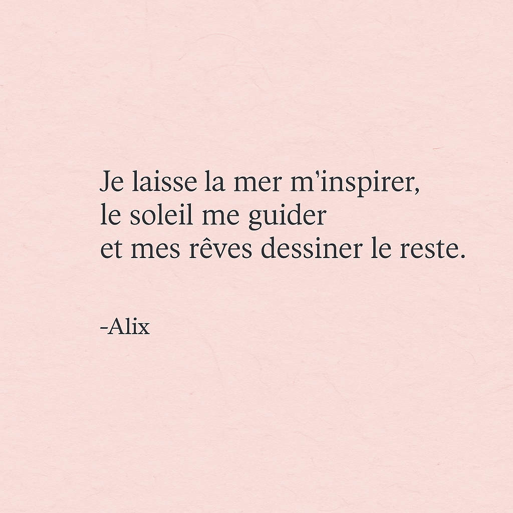 Toujours souriante, ouverte et curieuse, j’aime aller à la rencontre des gens, échanger, observer le monde qui m’entoure. Mes promenades en bord de mer, mes voyages, ou même de simples moments entre amis sont autant de sources d’inspiration. C’est dans ces instants de simplicité et de partage que naissent souvent mes meilleures idées — celles qui reflètent ma personnalité, entre douceur, soleil et créativité.