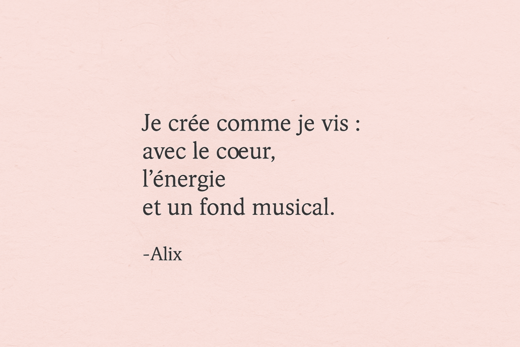 Je suis quelqu’un qui s’investit à 100 % dans tout ce que j’entreprends. Quand un projet me passionne, je le vis à fond, du début à la fin. La musique m’accompagne dans chaque étape : elle m’aide à trouver le rythme, à ressentir une ambiance, à faire émerger des idées. J’adore découvrir de nouveaux artistes, aller en festival, et me laisser porter par cette énergie collective qui me nourrit et m’inspire.
