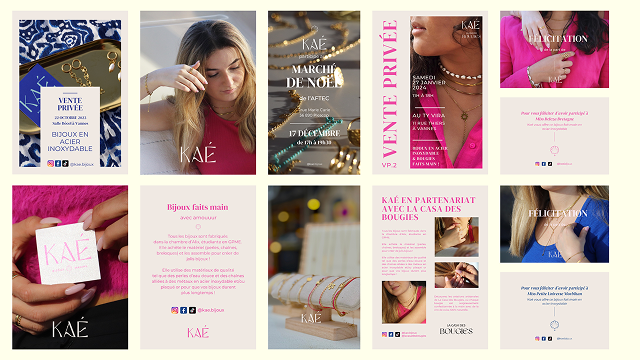 J’ai créé ma propre marque, Kaé Création, une entreprise de bijoux faits main et de visuels personnalisés. Je gère l’ensemble de la communication, de la conception des contenus à la création graphique, et je participe régulièrement à des marchés pour faire découvrir mes collections et échanger avec le public.
