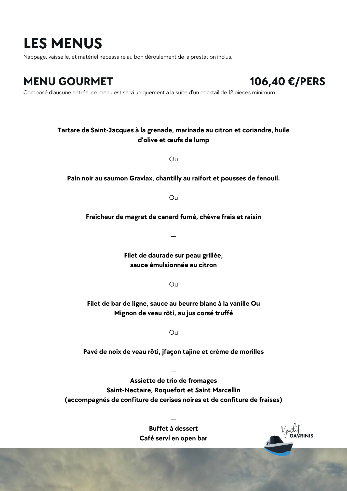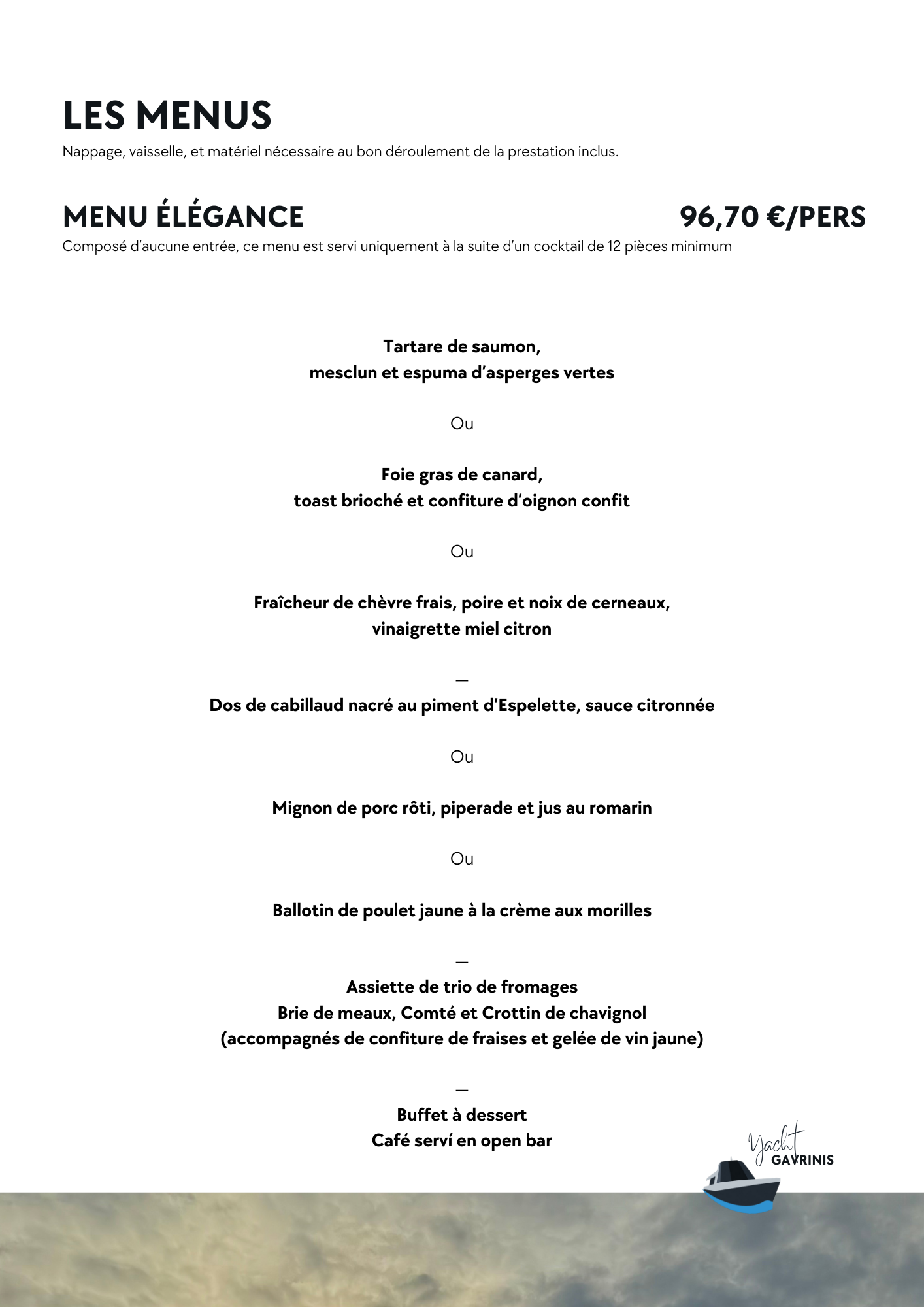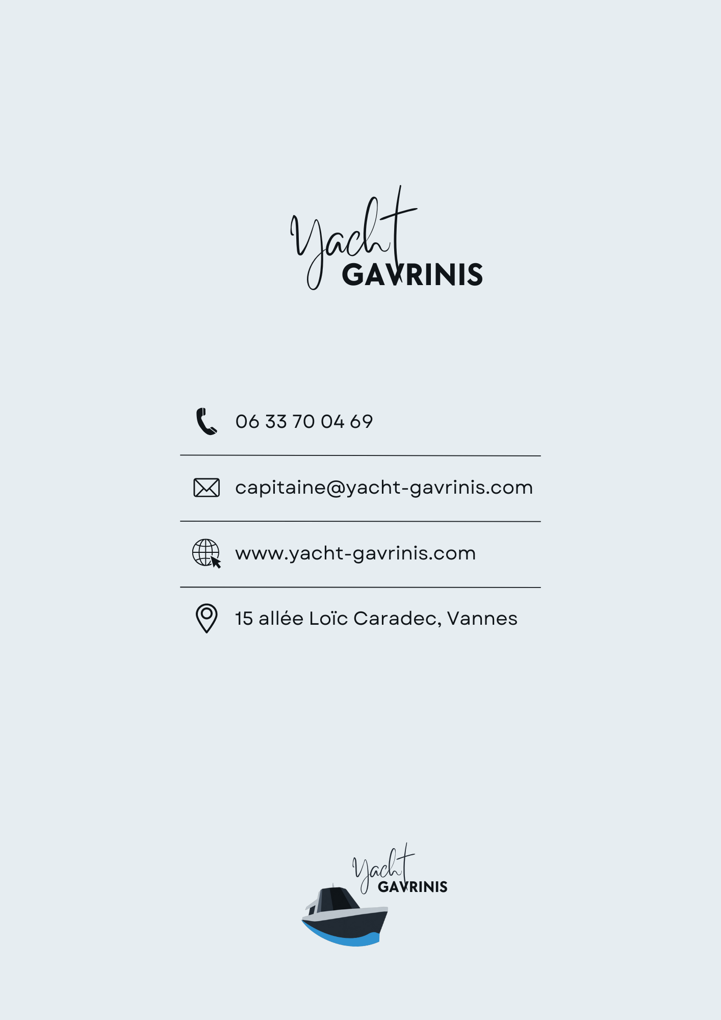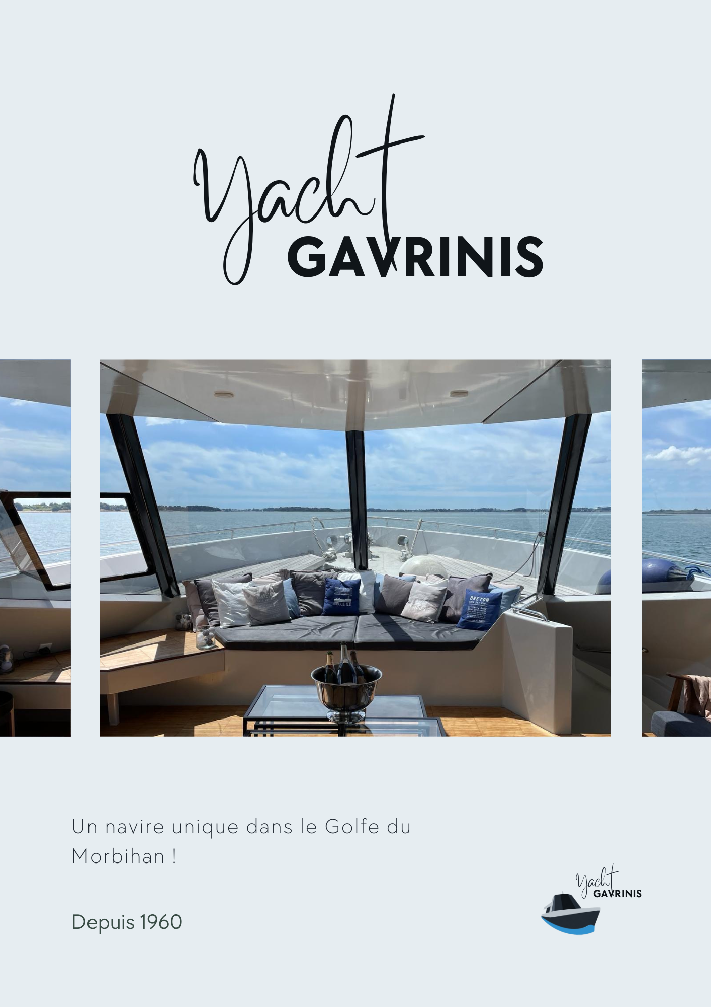 Ce flyer dédié aux entreprises valorise les prestations sur mesure du Yacht Gavrinis : séminaires, réunions ou événements professionnels dans un cadre exceptionnel. Il met en avant l’idée d’une expérience unique, entre travail et détente, où chaque détail est pensé pour allier efficacité, confort et convivialité.
