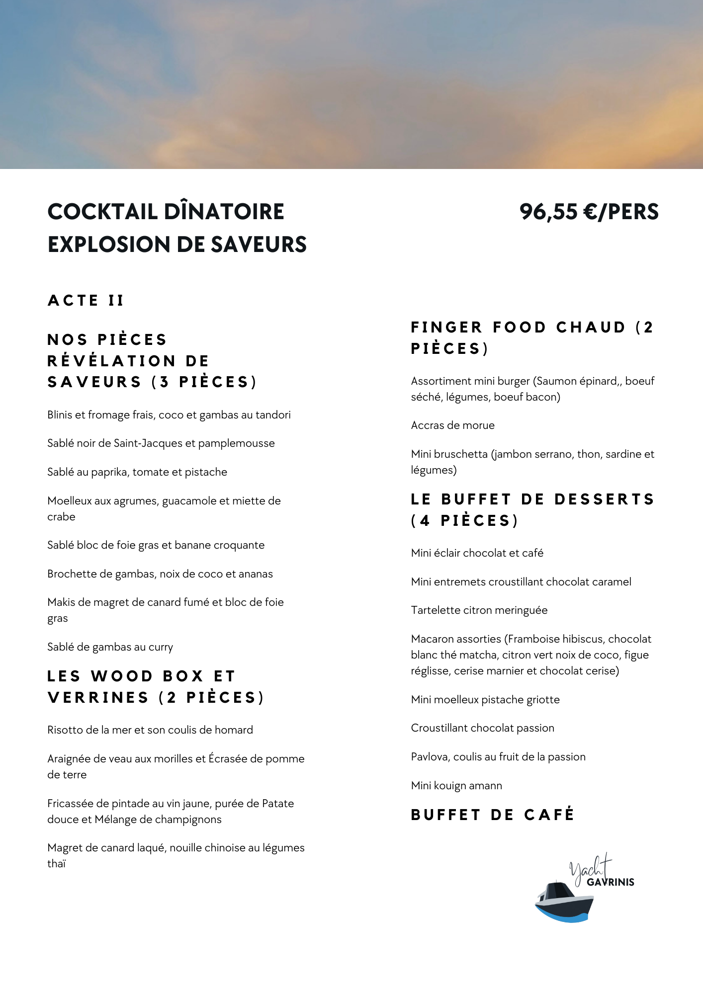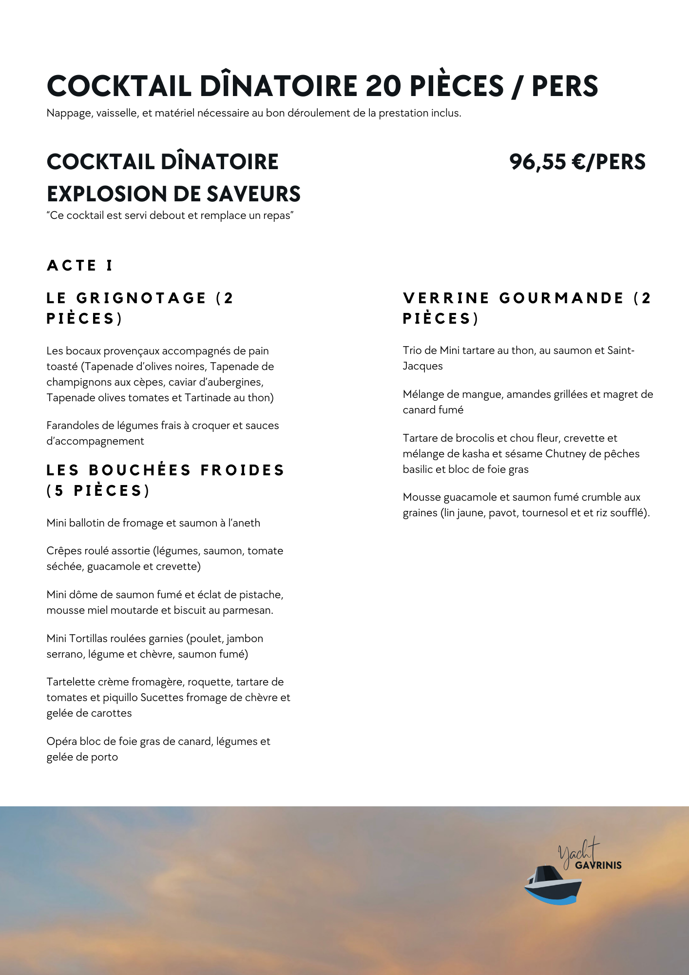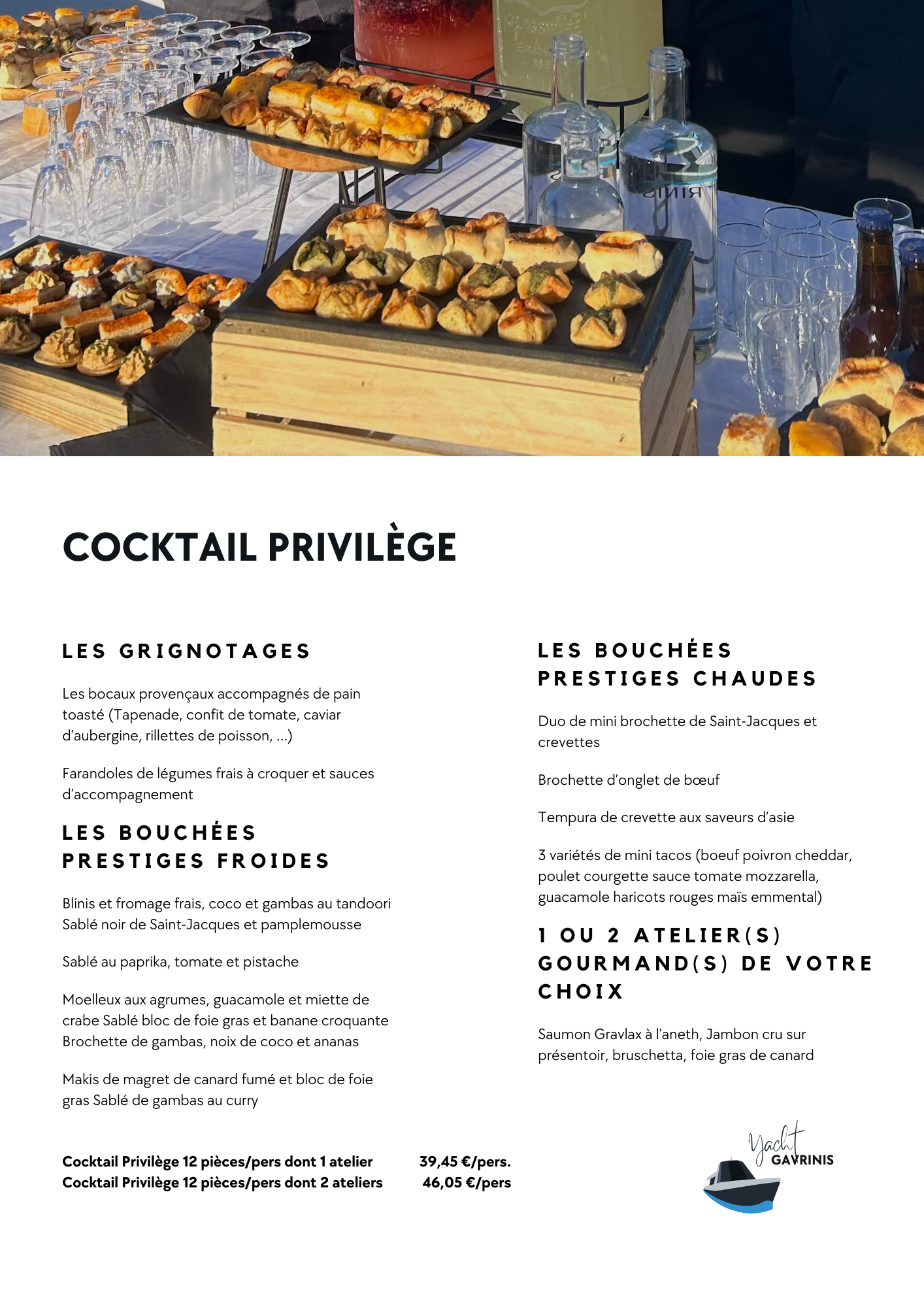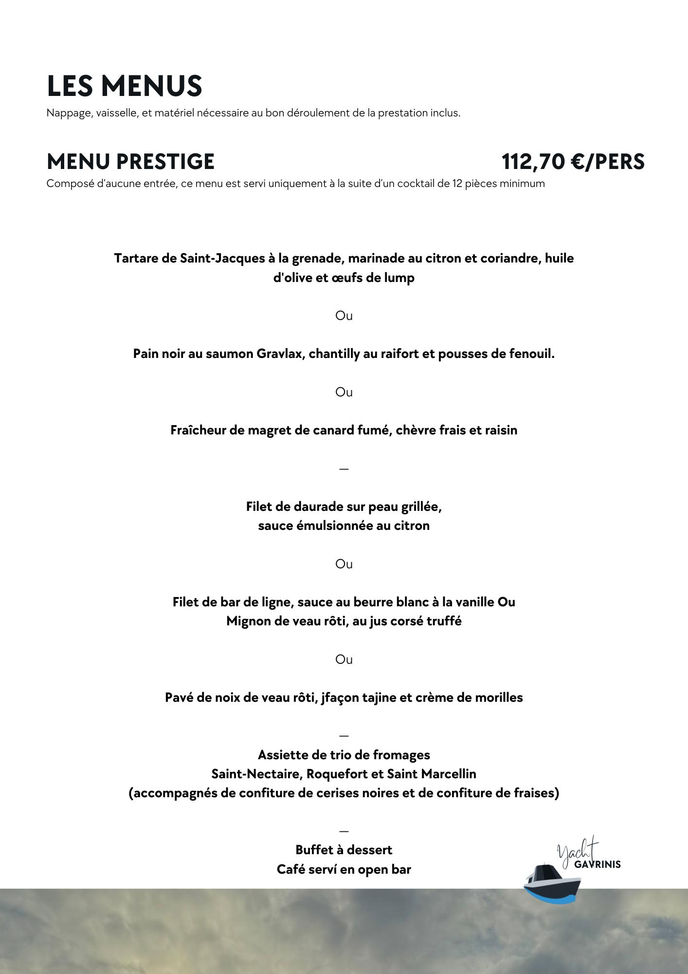 Ce flyer dédié aux entreprises valorise les prestations sur mesure du Yacht Gavrinis : séminaires, réunions ou événements professionnels dans un cadre exceptionnel. Il met en avant l’idée d’une expérience unique, entre travail et détente, où chaque détail est pensé pour allier efficacité, confort et convivialité.