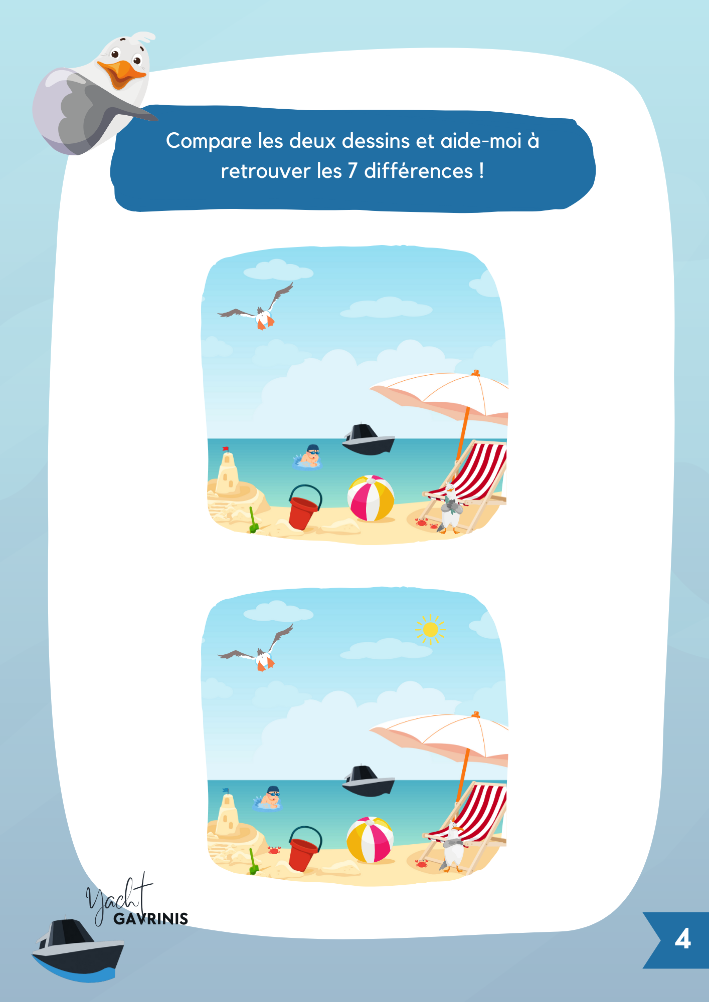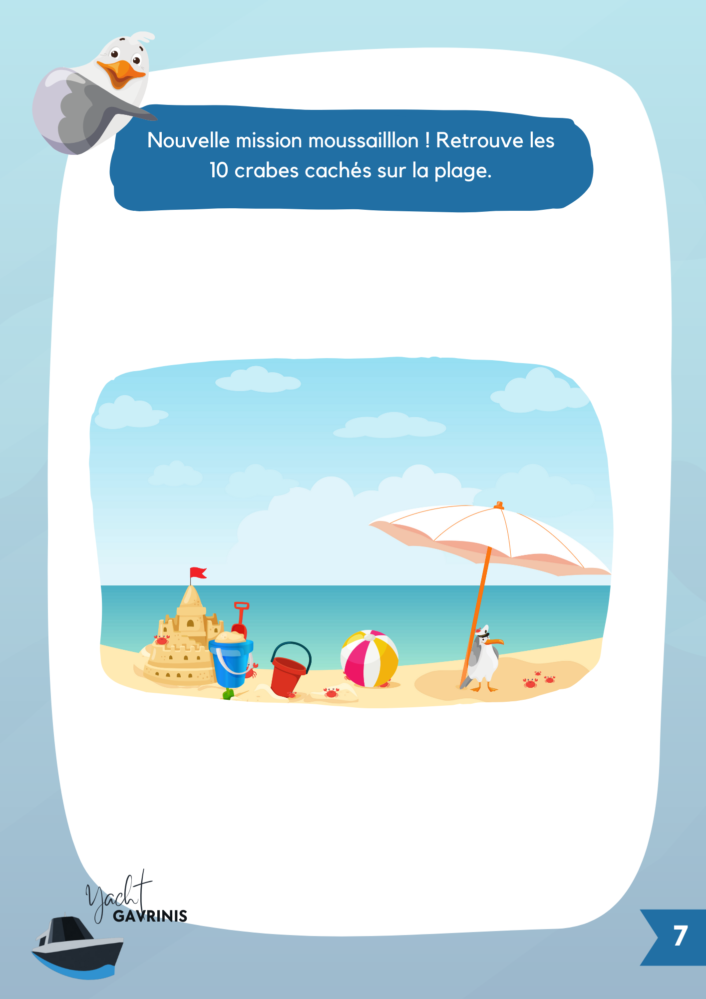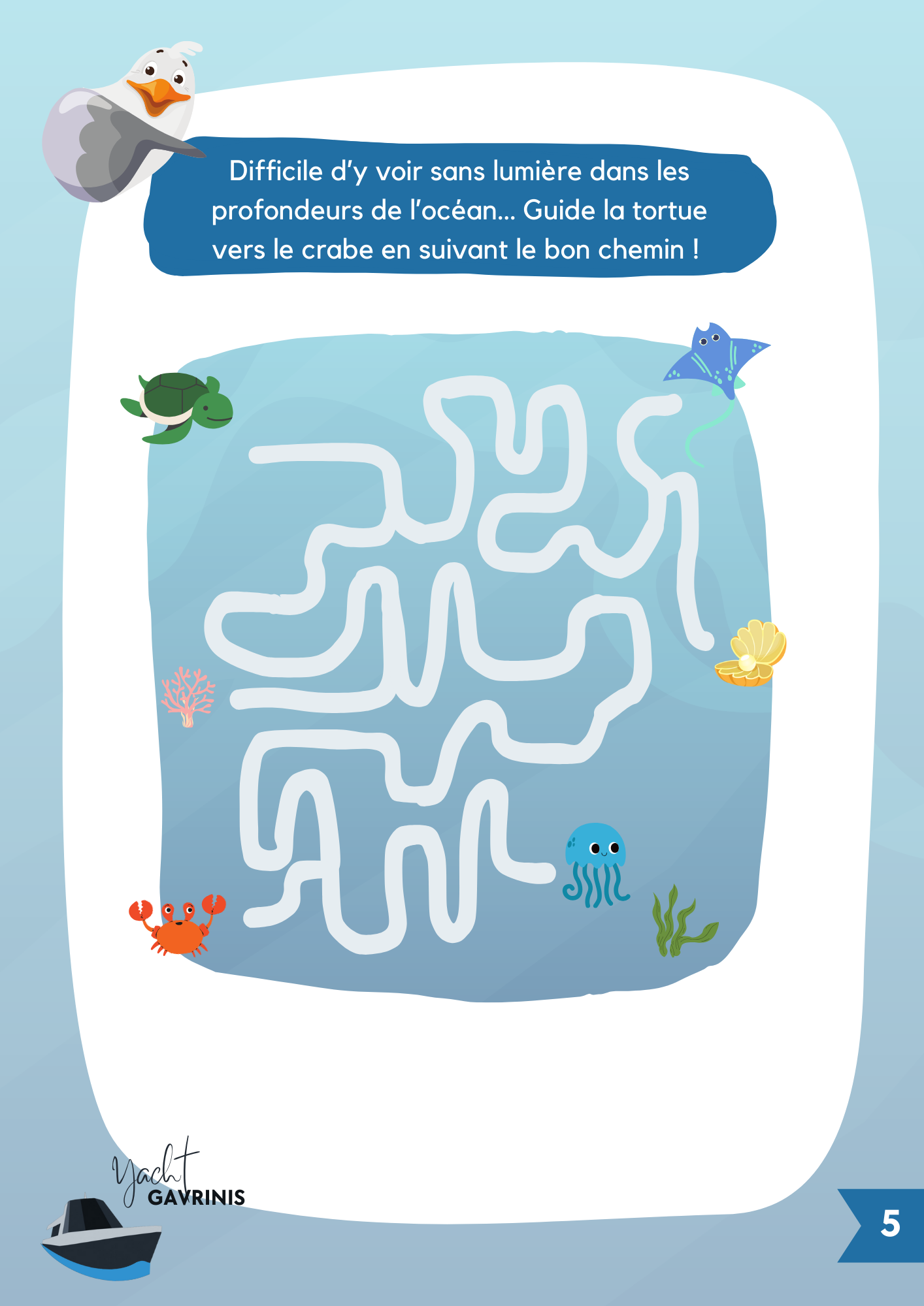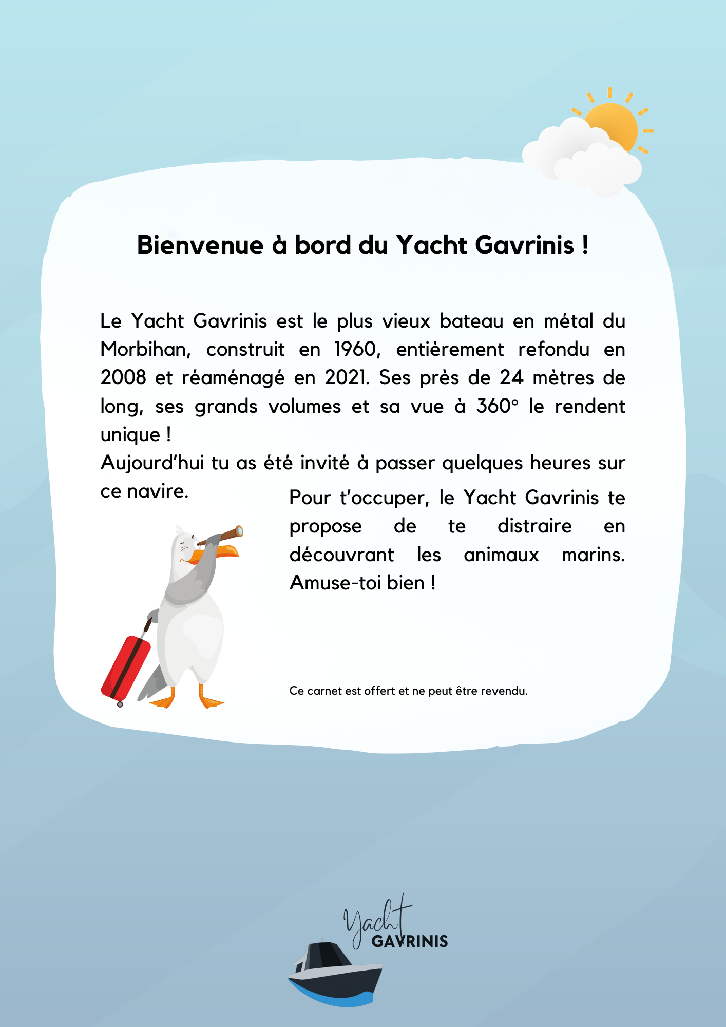 Lors de l’analyse des prestations du Yacht Gavrinis, j’ai constaté un problème récurrent : l’ennui des enfants pendant les repas. Pour y remédier, j’ai pris l’initiative de créer un carnet de jeux et de dessins, entièrement imaginé et conçu par moi-même.