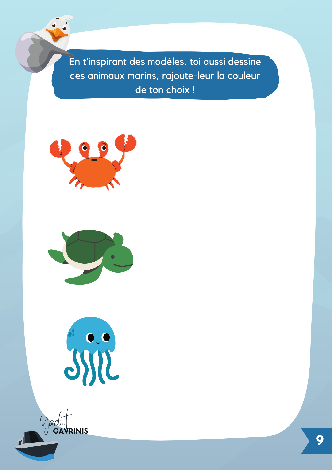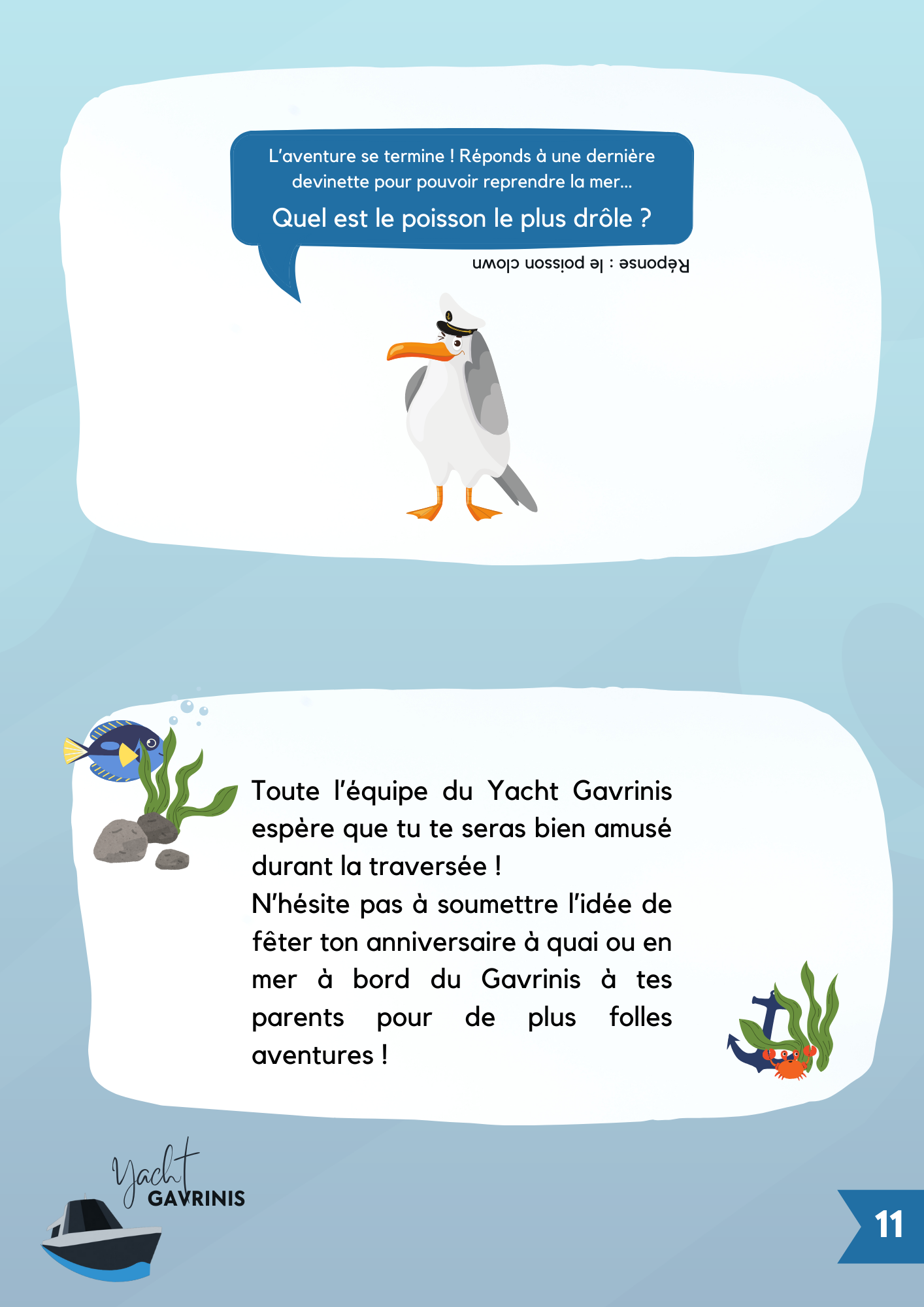 Ce carnet respecte la charte graphique du yacht tout en intégrant des illustrations et des visuels plus enfantins. La mascotte du yacht, une mouette (nommée Paulix), a été mise en avant pour présenter les différentes activités, rendant ainsi l’expérience à bord plus amusante et engageante pour les plus jeunes.