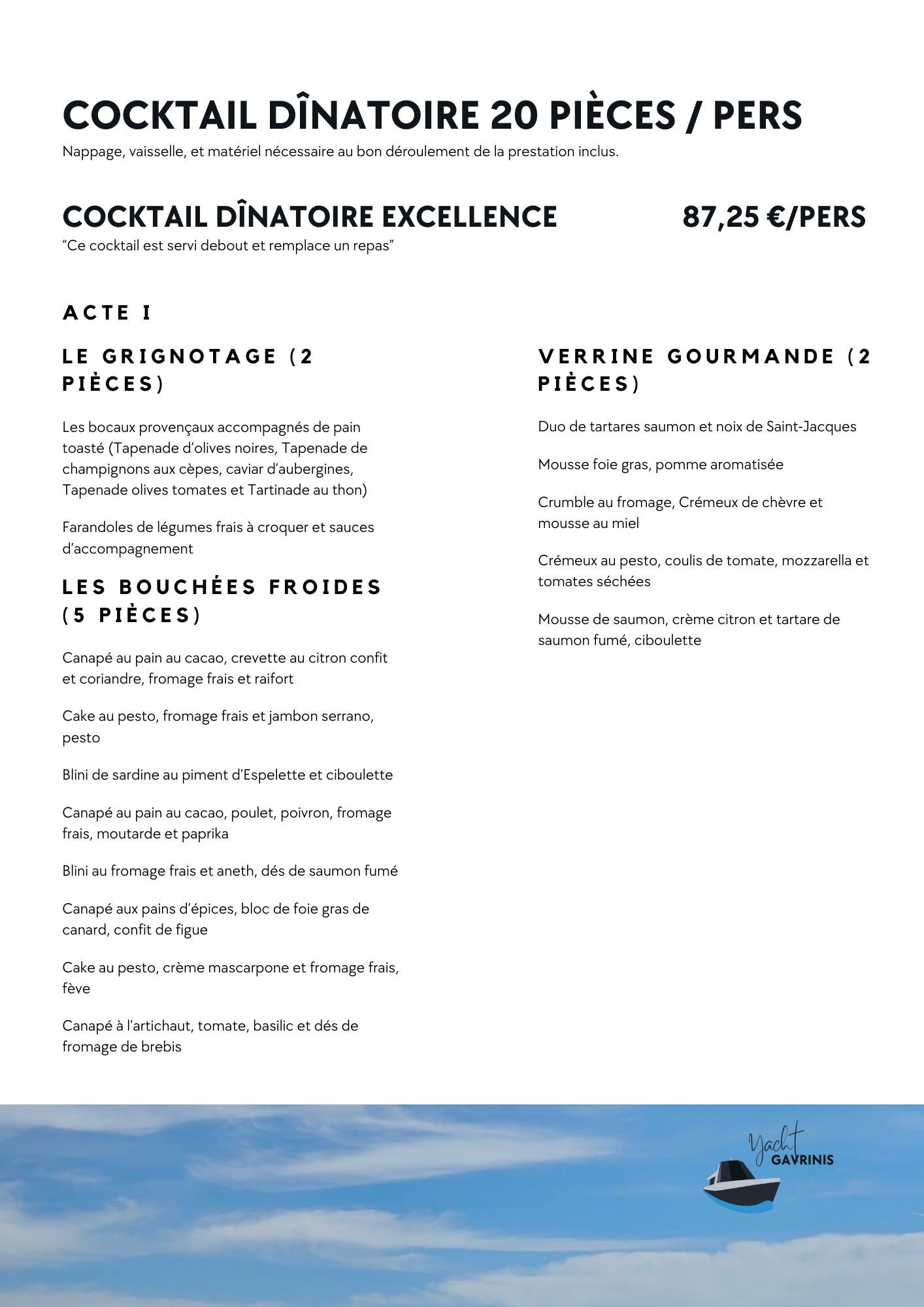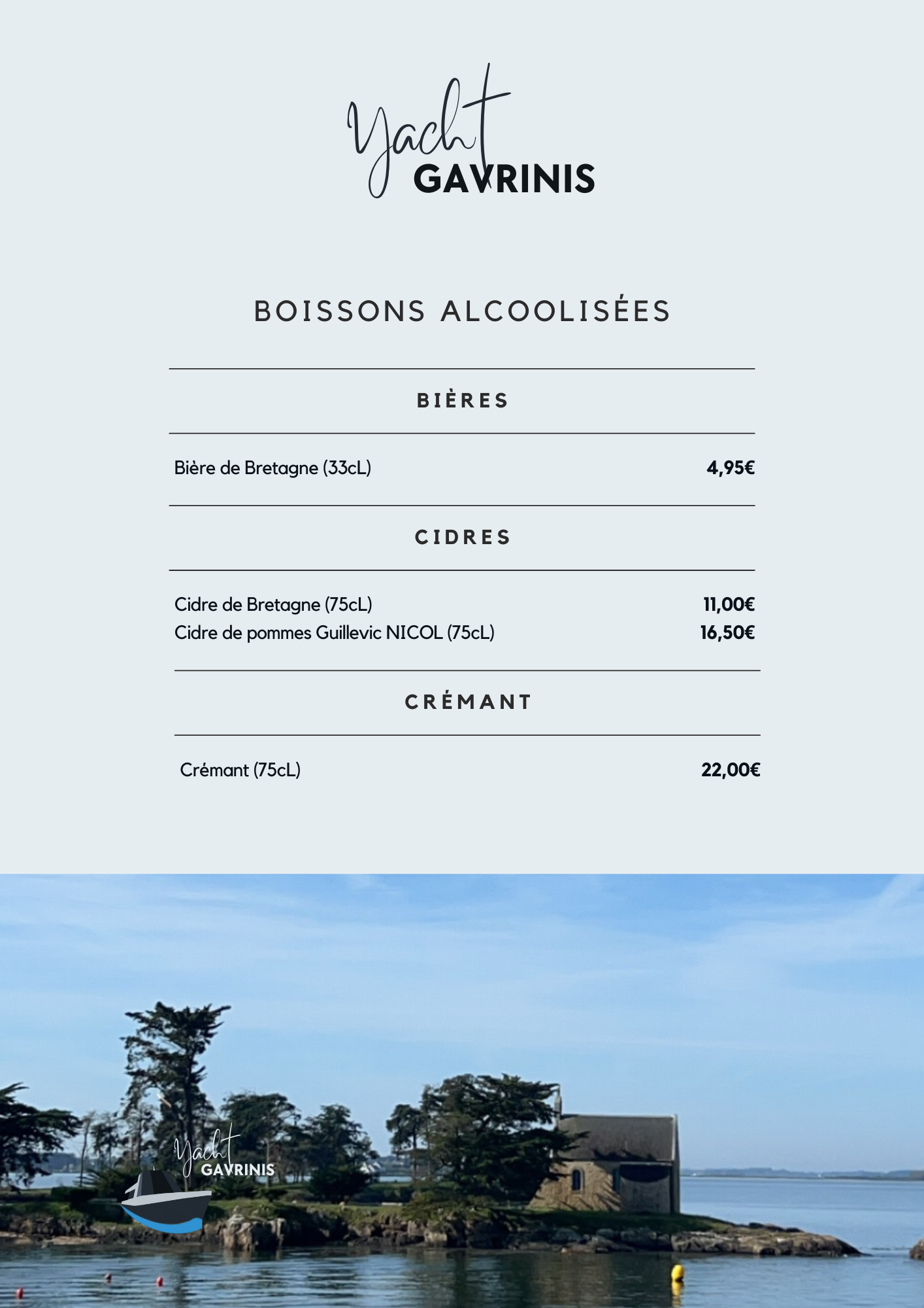 J’ai entièrement conçu les cartes des menus et des boissons du Yacht Gavrinis, en respectant la charte graphique que j’ai créée pour l’entreprise. Les deux visuels se complètent harmonieusement : un design épuré, des couleurs douces inspirées de la mer et des photographies soignées qui mettent en valeur les cocktails, desserts et menus proposés à bord. Le résultat : des supports cohérents, élégants et fidèles à l’identité du yacht.